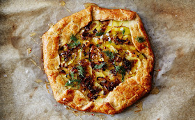 Ik gebruikte een kant-en-klaar quichedeeg van het merk Tante Fanny, waarvoor ik al eerder het pizza- en flammkuchendeeg probeerde. Over het andere deeg was ik al erg te spreken, en zo ook weer over deze rol. Niets mis mee. Je zou het eigenlijk als hartige taartdeeg moeten gebruiken, maar ik legde het in dit recept dus bovenop een vulling. De rol deeg, opgerold met bakpapier ertussen, is 32 cm in doorsnede, dus het is groot genoeg voor een grote vorm met een rand. Ik moest het randje hier in mijn grootste, ronde vorm omvouwen. Je zou er ook een hele snelle galette mee kunnen maken. Dat is een platte, ronde taart, waarvoor het deeg rechtstreeks op de bakplaat wordt gelegd. Als de vulling erop ligt, worden de randen ruim en rommelig naar binnen gevouwen, zoals bij deze foto (bron foto: Bon Appetit):